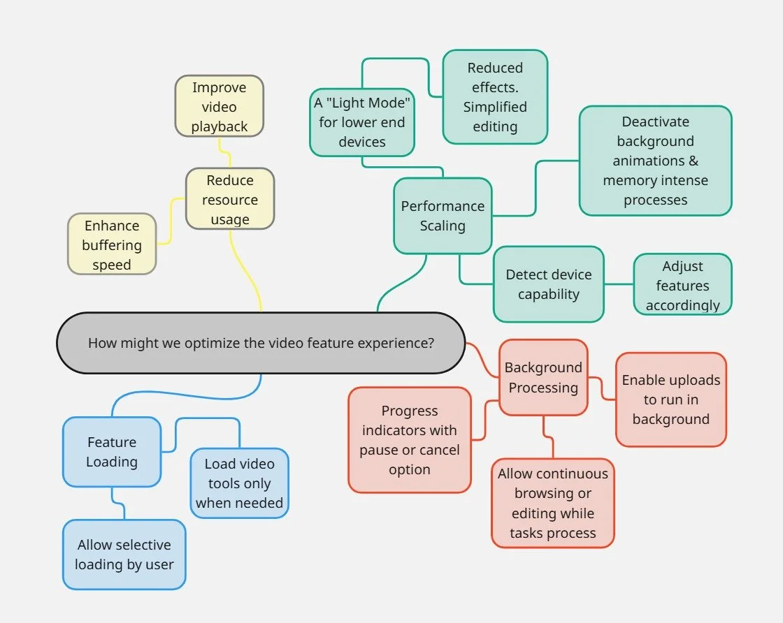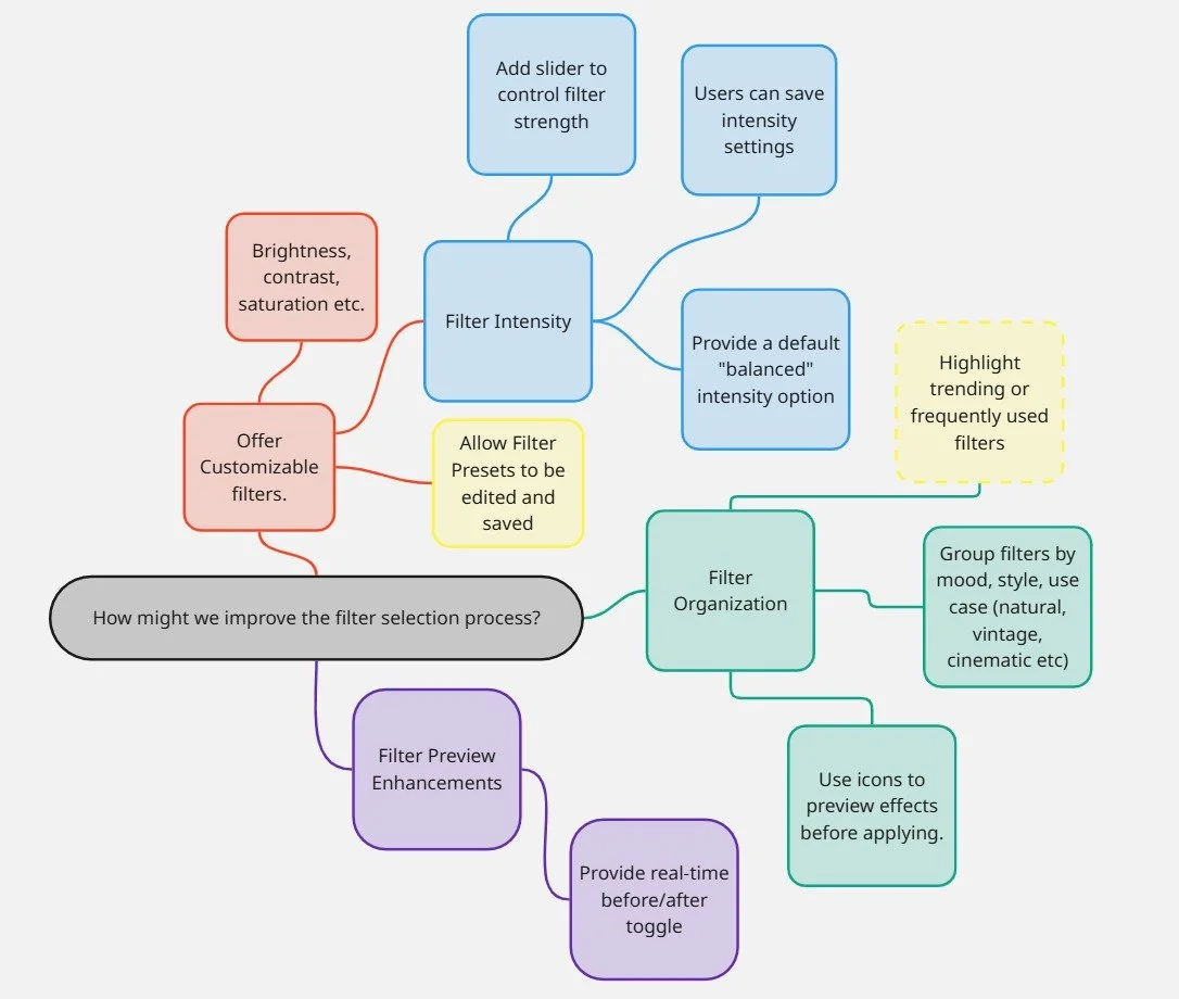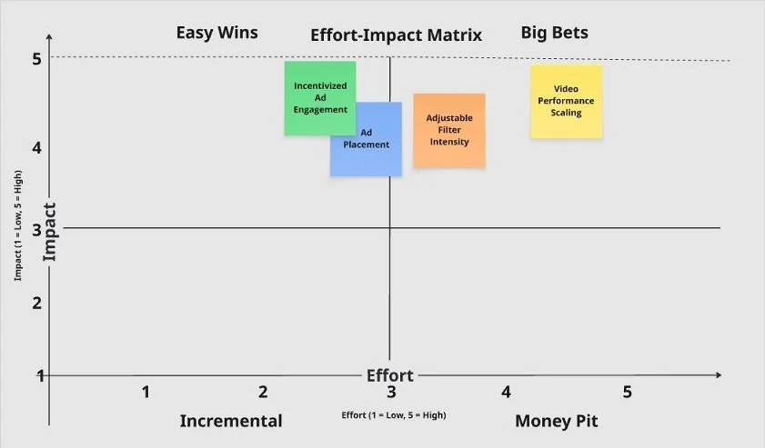 After gathering my insights I structured an ideation session and evaluation process conducted by a team of 5 individuals. Beginning with “How Might We” (HMW) questions we focused on three core areas of a photo app’s user experience: intrusive ads, video performance, and exaggerated filters. Through targeted mind mapping, we generated a wide range of innovative ideas and sub-ideas for each issue, fostering deeper exploration of user pain points. These ideas were then filtered and prioritized using a scorecard method, evaluating criteria such as user value, feasibility, and impact on retention. The most promising solutions were further mapped in an effort-impact matrix, helping us balance our ambitions with execution potential. Together, these frameworks provided a clear, data-informed path for moving from insight to action, supporting both strategic planning and creative innovation.
