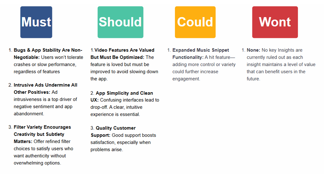 With seven key insights gathered, I used the MoSCoW method to separate what was essential from what was nice-to-have. The Value Proposition Canvas then helped articulate those insights into user pains and gains, ensuring that the eventual solution addressed the most critical engagement barriers for the 18–24 demographic.